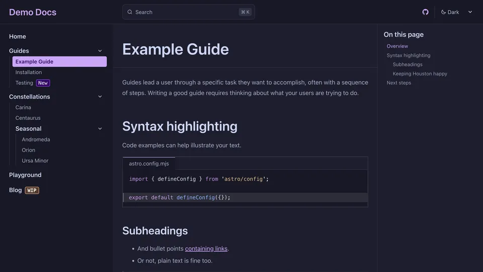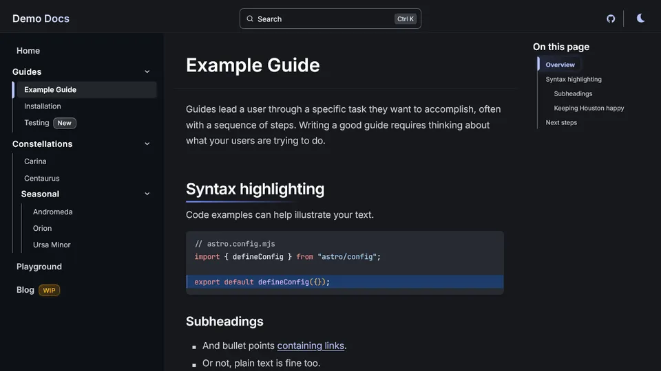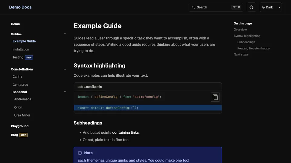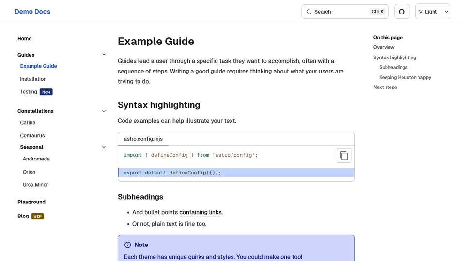 Preview a list of all themes below or try them out interactively on the Starlight Themes demo site.